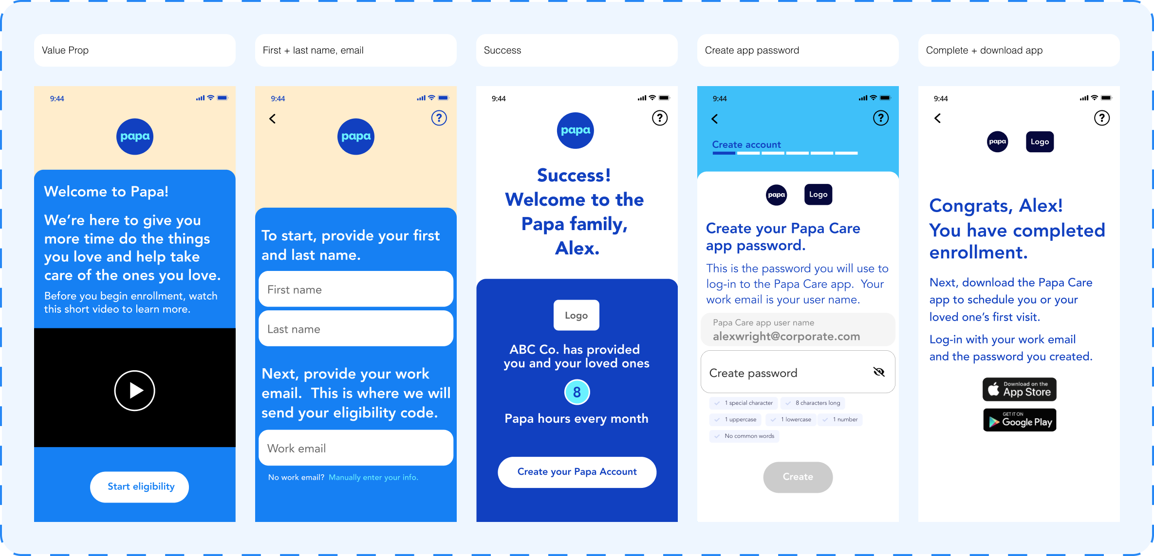 Papa was primarily offered through health care providers, like Medicare, Medicaid and Humana. Starting in 2022, a new avenue for members to access care from Papa Pals opened through their employer benefit. I worked on designing the sign up flow for this emerging market segment of Papa users: members signing up through their employer.